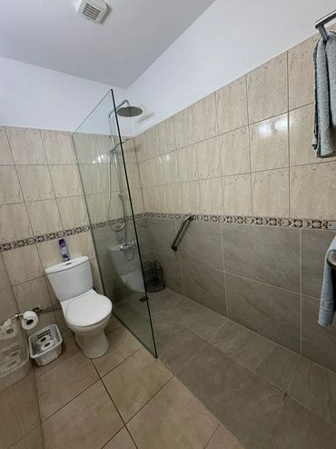 The bathroom is fully fitted with a large walk in shower, a wash basin and sink, beautifully clean and bright and fully tiled throughout.